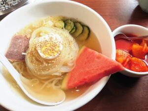 Morioka Reimen is distinguished by its unique style of being served with seasonal fruits such as watermelon, pear, or apple.